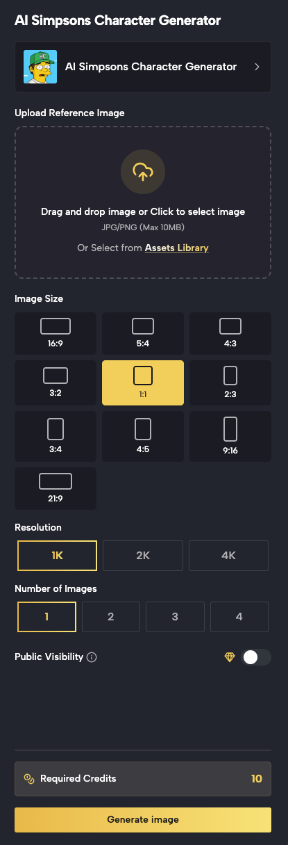 Randomly generate Simpsons OC characters with text descriptions using our AI Simpsons maker. Customize hairstyles, clothes, expressions, and actions to create your own Simpsons character. The AI Simpsons character creator allows you to generate up to 6 different images at a time, and you're free to choose your favorite one. In addition, you can select the aspect ratio of your generated images. This text-to-image feature makes the AI Simpsons tool perfect for creative storytelling and unique character design.